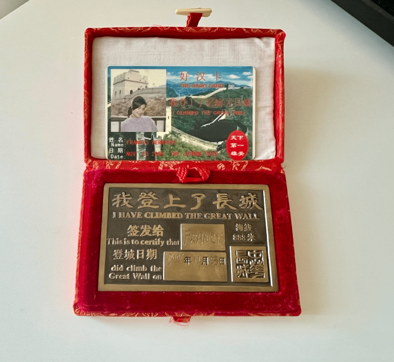 03. He recorrido casi el mundo entero, pero por más que me suba a cualquier avión, ya sea por 1 hora, me pone de los nervios. Aquí te muestro una medallita que me dieron al subir a los 12 años hasta lo “más alto” de la Muralla China.